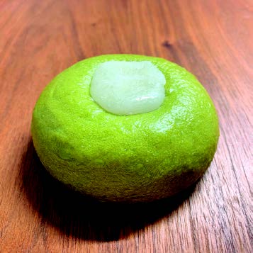 抹茶生地に粒あんを巻き込み求肥をのせた、京都らしい和ベーグル。