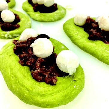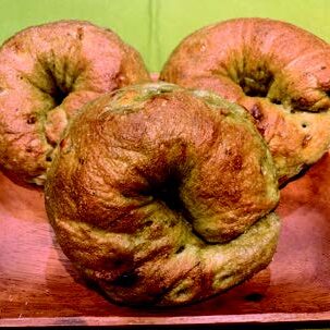 抹茶のベーグルでホワイトチョコと五色豆をしっかり包み込んで焼き上げました。