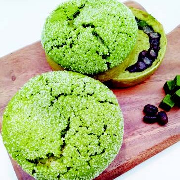 宇治抹茶生地に濃厚抹茶チョコと大納言小豆を包み、抹茶クッキーをのせたベーグル。